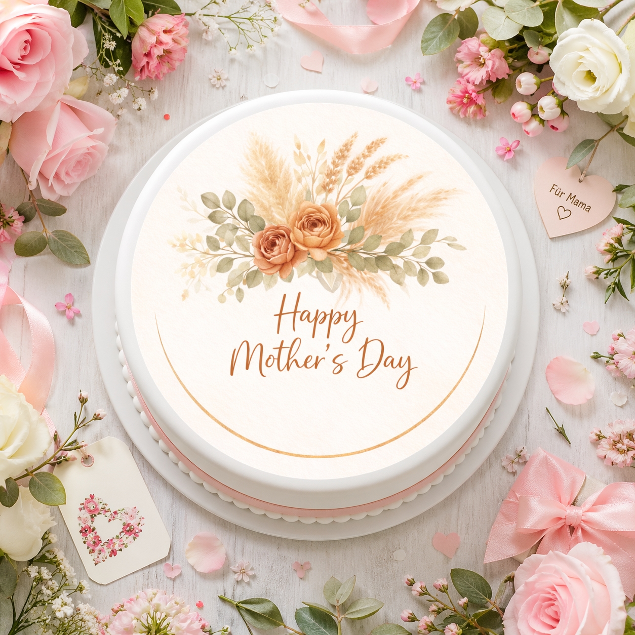 Dieses essbare Tortenbild mit dem Schriftzug „Happy Mothers Day“ überzeugt durch ein modernes, harmonisches Design mit zarten floralen Elementen in warmen Naturtönen. Die Kombination aus feinen Blumen und minimalistischer Gestaltung verleiht deiner Torte eine besonders hochwertige und edle Ausstrahlung.